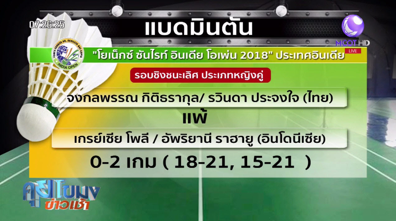แบดมินตัน “โยเน็กซ์ ซันไรท์ อินเดีย โอเพ่น 2018” ที่ประเทศอินเดีย รอบชิงชนะเลิศ ประเภทหญิงคู่ “กิ๊ฟ” จงกลพรรณ กิติธรากุล, “วิว” รวินดา ประจงใจ มือวาง 2 ของรายการ คู่มือ 11 ของโลก แพ้ เกรย์เซีย โพลี กับ อัพริยานี ราฮายู คู่มือวาง 3 ของรายการ และคู่มือ 7 ของโลกจากอินโดนีเซีย 0-2 เกม 18-21, 15-21 ได้เพียงรองแชมป์ รับเงินรางวัลปลอบใจ ประมาณ 438,900 บาท.-สำนักข่าวไทย