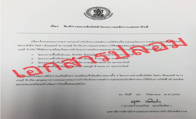 กรุงเทพฯ 7 ต.ค. – นางสาวนฤภัทร อมรโฆษิต เลขาธิการ สำนักงานคณะกรรมการกำกับกิจการพลังงาน (กกพ.) เปิดเผยว่า ขณะนี้มีบุคคลหรือกลุ่มบุคคลที่ไม่หวังดีปลอมแปลงประกาศสำนักงาน กกพ. ลงวันที่ 26 กันยายน 2559 เรื่อง รับพิจารณาผลิตไฟฟ้าโครงการพลังงานแสงอาทิตย์ โดยมีเจตนาเพื่อให้ผู้ประกอบการหรือผู้อื่นหลงเชื่อว่าเป็นประกาศที่แท้จริงและทำให้เกิดความเสียหาย ซึ่งเนื้อหาในประกาศปลอมแจ้งเรื่องผลการพิจารณาโครงการพลังงานแสงอาทิตย์ของบริษัท โซล่า อินเตอร์ พาวเวอร์ จำกัด ว่ามีความพร้อมในการทำโครงการพลังงานแสงอาทิตย์ตามแต่ละพื้นที่ของโครงการ และได้แจ้งให้บริษัทฯ ส่งมอบใบพิจารณาให้กับการไฟฟ้าฝ่ายผลิตแห่งประเทศไทย (กฟผ.) ดำเนินการต่อไป