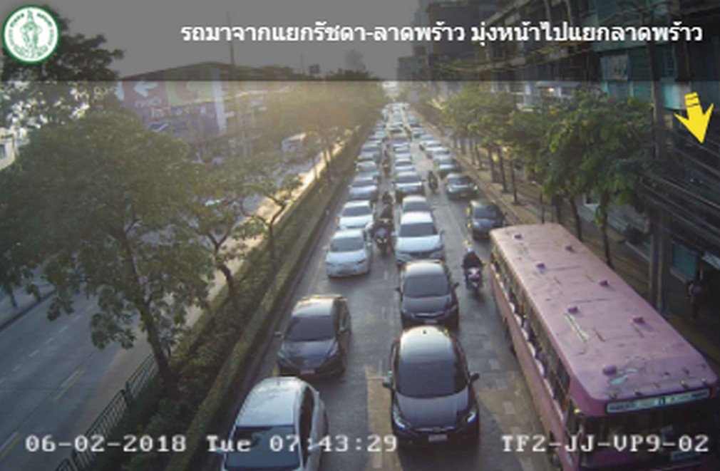 กทม. 6 ก.พ.-สวพ.FM 91 รายงานจราจรเช้าวันอังคาร ถนนลาดพร้าว ขาเข้า จากแยกรัชดา-ลาดพร้าว มุ่งหน้าปากทางลาดพร้าว รถเคลื่อนตัวช้า ท้ายสะสมอยู่ที่แยกโชคชัย