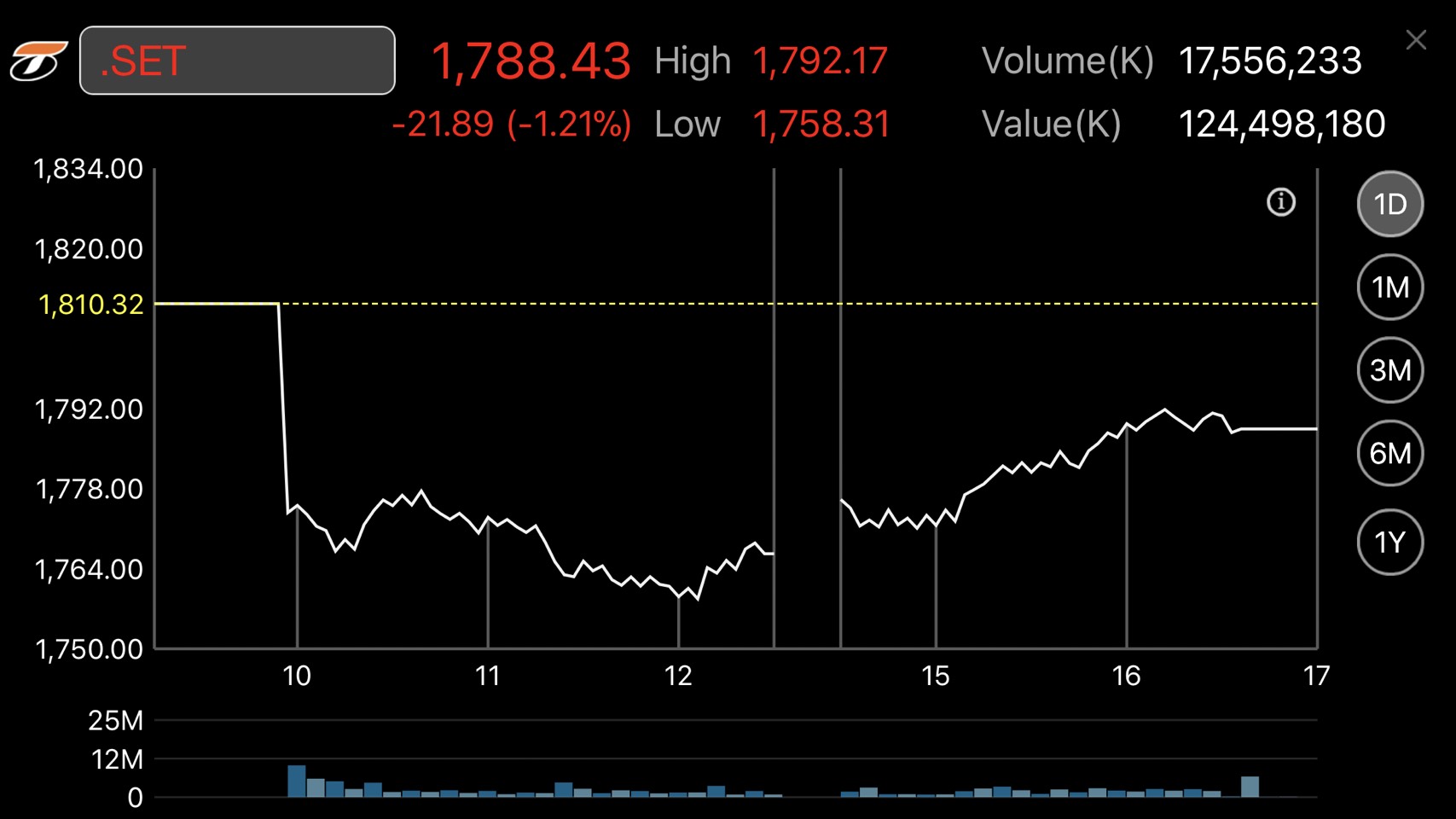 ผู้สื่อข่าวรายงานว่าดัชนีตลาดหลักทรัพย์ฯ ปิดที่ระดับ 1,788.43 จุด ลดลง 21.89 จุด (-1.21%) มูลค่าการซื้อขาย 124,498.18 ล้านบาท สูงสุดในรอบ 1 ปี 4 เดือน (จากเมื่อวันที่ 12 ตุลาคม 2559 มูลค่าการซื้อขายสูงสุดนับตั้งแต่เปิดตลาดอยู่ที่ 130,152.19 ล้านบาท) โดยดัชนีหุ้นไทยวันนี้ (6 ก.พ.) เคลื่อนไหวอยู่ในแดนลบตลอดทั้งวันปรับตัวลงไปมากกว่า 50 จุด แต่พอมาในช่วงบ่ายดัชนีฯ ดีขึ้นตามดาวโจนส์ฟิวเจอร์สได้ดีดตัวขึ้น และตลาดหุ้นในภูมิภาคเอเชียรีบาวด์ขึ้นได้บ้าง โดยดัชนีฯ แตะจุดสูงสุดที่ 1,792.17 จุด และแตะจุดต่ำสุดที่ระดับ 1,758.31 จุด