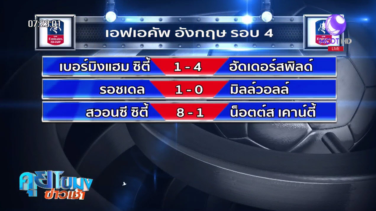 ผลฟุตบอลเอฟเอคัพ อังกฤษ รอบที่ 4 นัดรีเพลย์ ฮัดเดอร์ฟิลด์ ทาวน์ จากพรีเมียร์ลีกบุกชนะ เบอร์มิงแฮม ทีมระดับแชมเปียนชิพ ในช่วงต่อเวลาพิเศษ 4-1 หลังเสมอกันใน 90 นาที 1-1 ทำให้ผ่านเข้ารอบไปพบกับ แมนเชสเตอร์ ยูไนเต็ด ในรอบที่ 5 ต่อไป