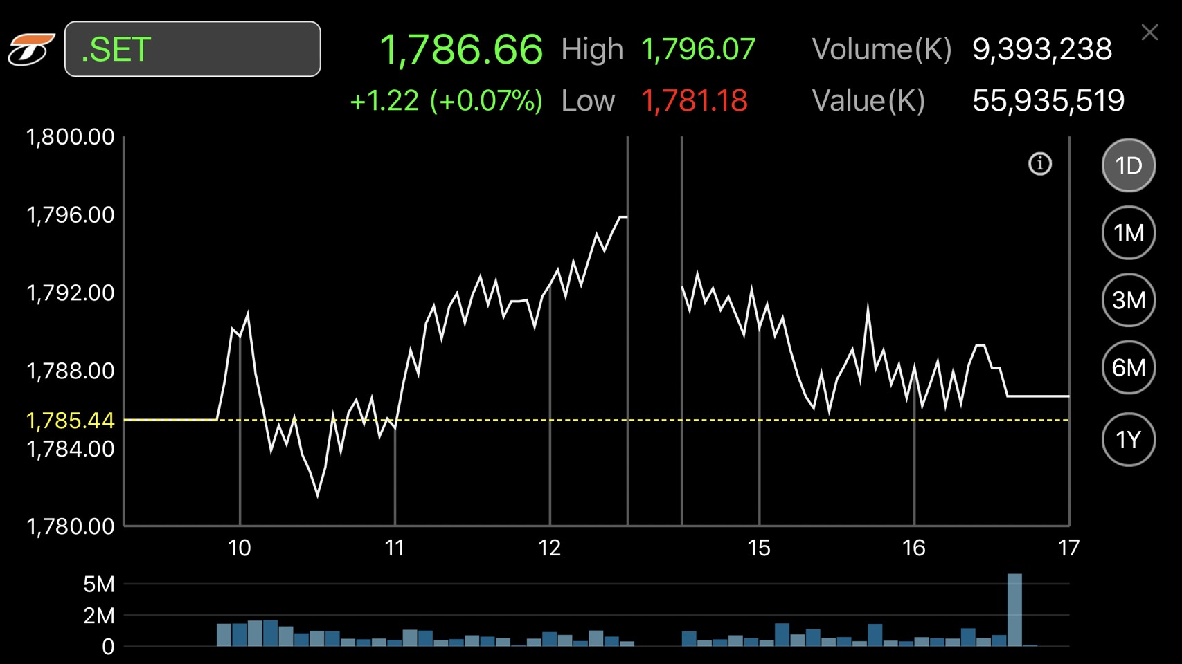 ผู้สื่อข่าวรายงานว่าดัชนีตลาดหลักทรัพย์ฯ ปิดที่ระดับ 1,786.66 จุด เพิ่มขึ้น 1.22 จุด หรือร้อยละ 0.07 มูลค่าการซื้อขาย 55,935.52 ล้านบาท การซื้อขายหุ้นวันนี้ (8 ก.พ.) ดัชนีหุ้นไทยเคลื่อนไหวทั้งแดนบวก-ลบ โดยดัชนีฯ แตะจุดสูงสุดที่ 1,796.07 จุด และต่ำสุดที่ระดับ 1,781.18 จุด