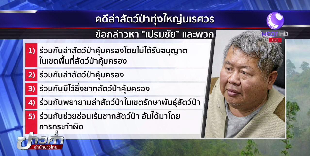 กทม. 8 ก.พ. – สำหรับการดำเนินคดีนายเปรมชัย พร้อมพวกรวม 4 คน เบื้องต้นยังคงถูกดำเนินคดีใน 9 ข้อกล่าวหา โดยข้อหาหลักเกี่ยวกับการล่าสัตว์ป่า โทษสูงสุดคือจำคุก 10 ปี