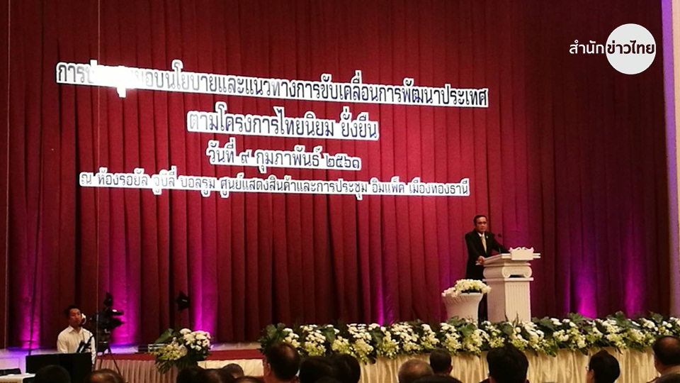 เมืองทอง 9 ก.พ.-นายกรัฐมนตรี มอบนโยบายไทยนิยมยั่งยืน ยึดประชาชนเป็นศูนย์กลาง เน้นความเท่าเทียม เป็นธรรม ทำให้ประชาชนมีความเป็นอยู่ที่ดีขึ้น หยุดจับผิดโครงการ ว่าจะทำให้รัฐบาลอยู่ยาว เลิกมองแง่ร้าย จับผิดการใช้งบประมาณ ย้ำโครงการไทยนิยมยั่งยืน ไม่ใช่ชาตินิยม หรือประชานิยม จี้ผู้ว่าฯ ช่วยดูแลพื้นที่ป่า เพราะเจ้าหน้าที่ป่าไม้มีน้อย