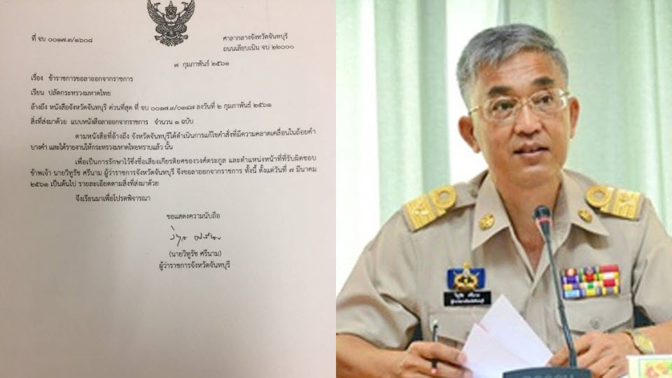 กรุงเทพฯ 9 ก.พ.- ผู้ว่าฯ จันทบุรียื่นหนังสือลาออกจากตำแหน่ง ขณะที่ ปลัด มท. ยังไม่ทราบรายละเอียด