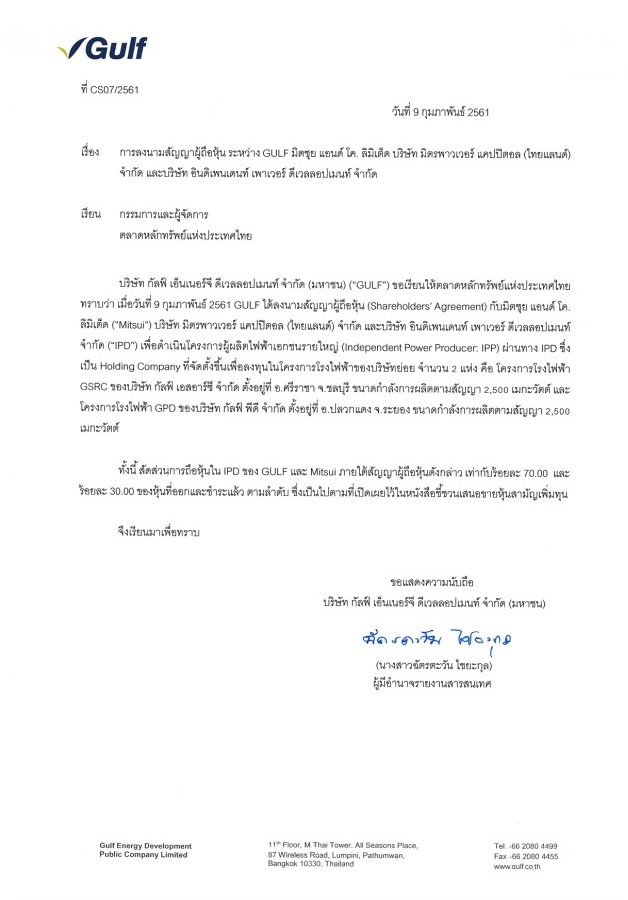 บมจ.กัลฟ์ เอ็นเนอร์จี ดีเวลลอปเมนท์ (GULF) แจ้งว่าวันนี้ (9 ก.พ.) ได้ลงนามสัญญาผู้ถือหุ้น (Shareholders’ Agreement) กับมิตซุย แอนด์ โค.ลิมิเต็ด (Mitsui) ,บริษัท มิตรพาวเวอร์ แคปปิตอล (ไทยแลนด์) จำกัด และบริษัท อินดิเพนเดนท์ เพาเวอร์ ดีเวลลอปเมนท์ จำกัด (IPD) เพื่อดำเนินโครงการผู้ผลิตไฟฟ้าเอกชนรายใหญ่ (IPP) ผ่านทาง IPD ซึ่งเป็นโฮลดิ้งคอมพะนีที่จัดตั้งขึ้นเพื่อลงทุนในโครงการโรงไฟฟ้าไอพีพีของบริษัทย่อย 2 แห่ง คือ โครงการโรงไฟฟ้า GSRC ของบริษัท กัลฟ์ เอสอาร์ซี จำกัด ตั้งอยู่ที่ อ.ศรีราชา จ.ชลบุรี ขนาดกำลังการผลิตตามสัญญา 2,500 MW และโครงการโรงไฟฟ้า GPD ของบริษัท กัลฟ์ พีดี จำกัด ตั้งอยู่ที่ อ.ปลวกแดง จ.ระยอง ขนาดกำลังการผลิตตามสัญญา 2,500 เมกะวัตต์
