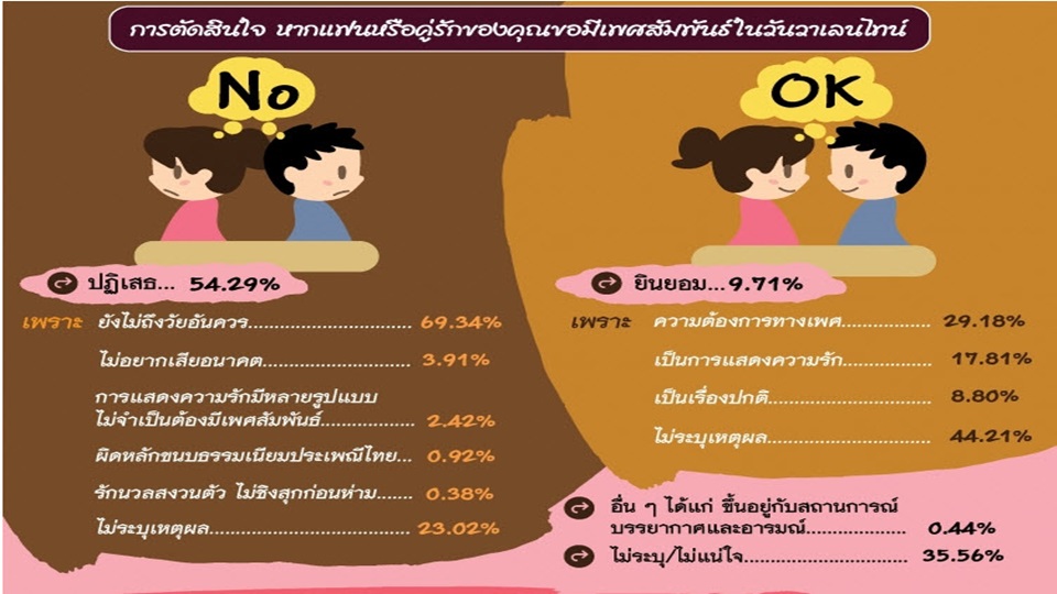สำหรับการตัดสินใจหากแฟนหรือคู่รักขอมีเพศสัมพันธ์ในวันวาเลนไทน์ พบว่าวัยรุ่นไทยส่วนใหญ่ ร้อยละ 54.29 ระบุว่า ปฏิเสธ รองลงมาร้อยละ 35.56 ระบุว่า ไม่ระบุ/ไม่แน่ใจ ร้อยละ 9.71 ระบุว่า ยินยอม และร้อยละ 0.44 ระบุอื่น ๆ ได้แก่ ถ้าอยู่ในวัยที่เหมาะสมแล้วจะยินยอมไม่ใช่เรื่องแปลก ให้ดูตามความเหมาะสม ขึ้นอยู่กับบรรยากาศและอารมณ์ ทั้งนี้ในจำนวนของตัวอย่างที่ระบุว่าปฏิเสธให้เหตุผลว่ายังไม่ถึงวัยอันควร, ไม่อยากเสียอนาคต,การแสดงความรักมีหลายรูปแบบ ไม่จำเป็นต้องมีเพศสัมพันธ์,ผิดหลักขนบธรรมเนียมประเพณีไทย และรักนวลสงวนตัว ไม่ชิงสุกก่อนห่าม ส่วนตัวอย่างที่ระบุว่ายินยอม ให้เหตุผลว่า ความต้องการทางเพศ, เป็นการแสดงความรัก และเป็นเรื่องปกติ