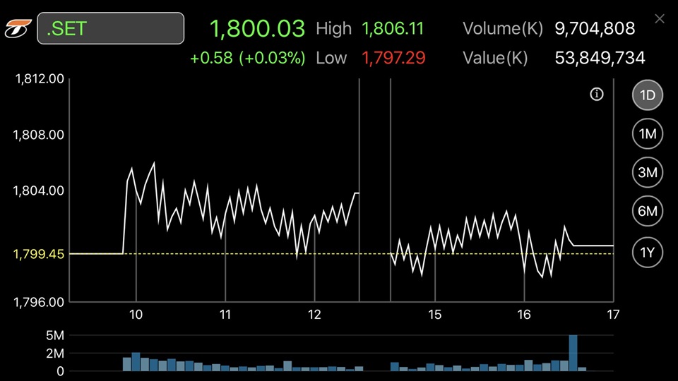 ผู้สื่อข่าวรายงานว่า การซื้อขายหุ้นวันนี้ ดัชนีหุ้นไทยเคลื่อนไหวในแดนบวกเป็นส่วนใหญ่ โดยดัชนีฯแตะจุดสูงสุดที่ 1,806.11 จุด และแตะจุดต่ำสุดที่ระดับ 1,797.29 จุด