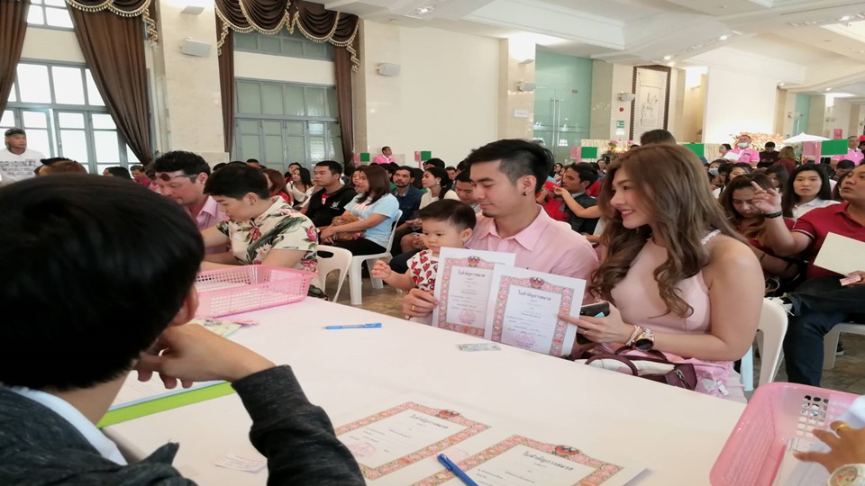 กทม.14 ก.พ.-การจดทะเบียนสมรสที่ไปรษณีย์กลาง บางรัก อบอวลไปด้วยบรรยากาศแห่งความรัก ช่วงครึ่งวันเช้ามีผู้ขอจดทะเบียนแล้วกว่า 500 คน