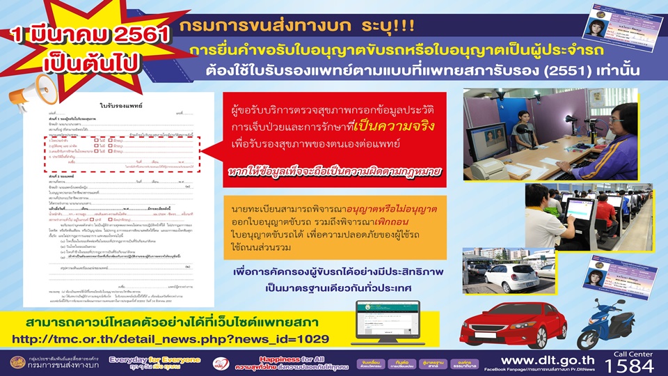 นายสนิท พรหมวงษ์ อธิบดีกรมการขนส่งทางบก เปิดเผยว่า ตั้งแต่วันที่ 1 มีนาคม 2561 เป็นต้นไป กรมการขนส่งทางบกกำหนดให้ผู้ขอรับใบอนุญาตขับรถตามกฎหมายว่าด้วยรถยนต์และผู้ขอรับใบอนุญาตเป็นผู้ประจำรถตามกฎหมายว่าด้วยการขนส่งทางบก ต้องใช้ใบรับรองแพทย์ประกอบการยื่นคำขอดำเนินการ เพื่อแสดงว่าผู้ขอไม่มีโรคประจำตัวอันอาจเป็นอันตรายขณะขับรถ โดยต้องเป็นใบรับรองแพทย์ตามแบบมาตรฐานที่แพทยสภารับรอง (2551) ซึ่งเป็นมาตรฐานเดียวกันทั่วประเทศเท่านั้น เพื่อให้การตรวจสอบลักษณะต้องห้ามในการขอรับใบอนุญาตขับรถและใบอนุญาตเป็นผู้ประจำรถเป็นไปอย่างมีประสิทธิภาพ
