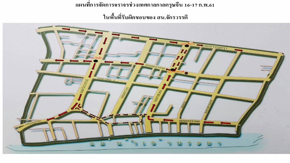 พล.ต.ต.ดุสิต สมศักดิ์ ผู้บังคับการตำรวจนครบาล 6 กล่าวว่า วันนี้ จะมีการจัดการจราจร โดยรอบถนนเยาวราช เพื่อรองรับเทศกาลตรุษจีน โดยจะปิดการจราจรในถนนเยาวราช ตั้งแต่วงเวียนโอเดียน – แยกราชวงศ์ ตั้งแต่เวลา 12.00 – 24.00 น. ในวันที่ 16 ก.พ. 61 เนื่องจากถนนเยาวราช ตลอดทั้งแนวมีการตั้งซุ้มและกิจกรรมออกร้าน ดังนั้นเพื่อให้ประชาชนเดินชมและชิมอาหารจำเป็นจะต้องปิดการจราจรในช่วงที่มีการจัดงาน