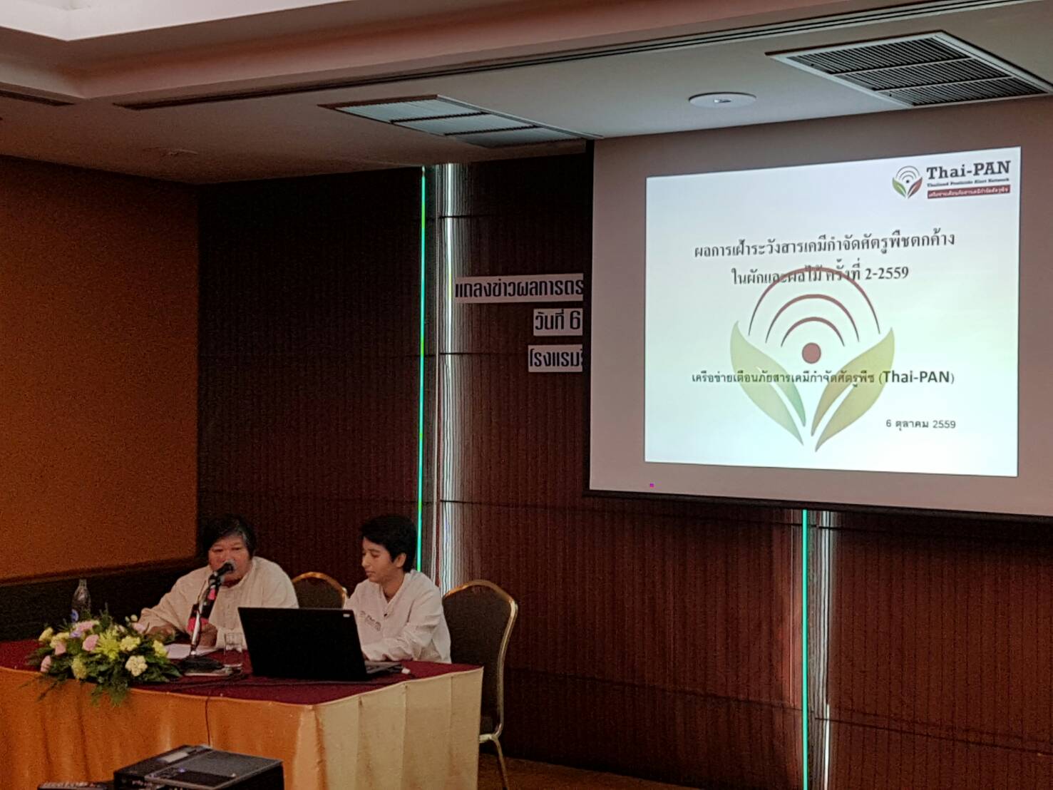 เครือข่ายเตือนภัยสารเคมีกำจัดศัตรูพืช Thai-Pan แถลงผลการตรวจสอบสารพิษตกค้างในผักผลไม้รอบที่ 2 ประจำปี 2559 โดย น.ส.ปรกชล อู๋ทรัพย์ ผู้ประสานงานเครือข่ายฯ เปิดเผยว่า จากการสุ่มเก็บตัวอย่างผักและผลไม้ที่นิยมบริโภค 16 ชนิด คือ พริกแดง กะเพรา ถั่วฝักยาว คะน้า ผักบุ้ง ผักกาดขาว กะหล่ำปลี แตงกวา มะเขือเปราะ และมะเขือเทศ และ ผลไม้ 6 ชนิด คือ ส้มสายน้ำผึ้ง มะละกอ แตงโม แคนตาลูป ฝรั่ง และแก้วมังกร รวม 158 ตัวอย่าง ระยะเวลาเก็บตัวอย่างช่วงระหว่างวันที่ 23-29 ส.ค. 2559 จากห้างโมเดิร์นเทรดชื่อดัง (บิ๊กซี,แมคโคร,เทสโก้โลตัส) และตลาดค้าส่ง (ตลาดไท,ตลาดปฐมมงคล จ.นครปฐม,ตลาดศรีเมือง จ.ราชบุรี) รวมทั้งผักผลไม้ที่ติดฉลากปลอดภัยและเกษตรอินทรีย์จากซูเปอร์มาร์เก็ต อาทิ กูร์เม่มาร์เก็ต ท็อปส์ แม็กแวลู ฯลฯ ส่งวิเคราะห์หาสารเคมีกำจัดศัตรูพืชตกค้างแบบ Multi Residue Pesticide Screen (MRPS) พบมีสารพิษตกค้างเกินมาตรฐาน (MRL) ถึง 56 เปอร์เซนต์ ซึ่งเกินครึ่งของตัวอย่าง 158 ตัวอย่าง