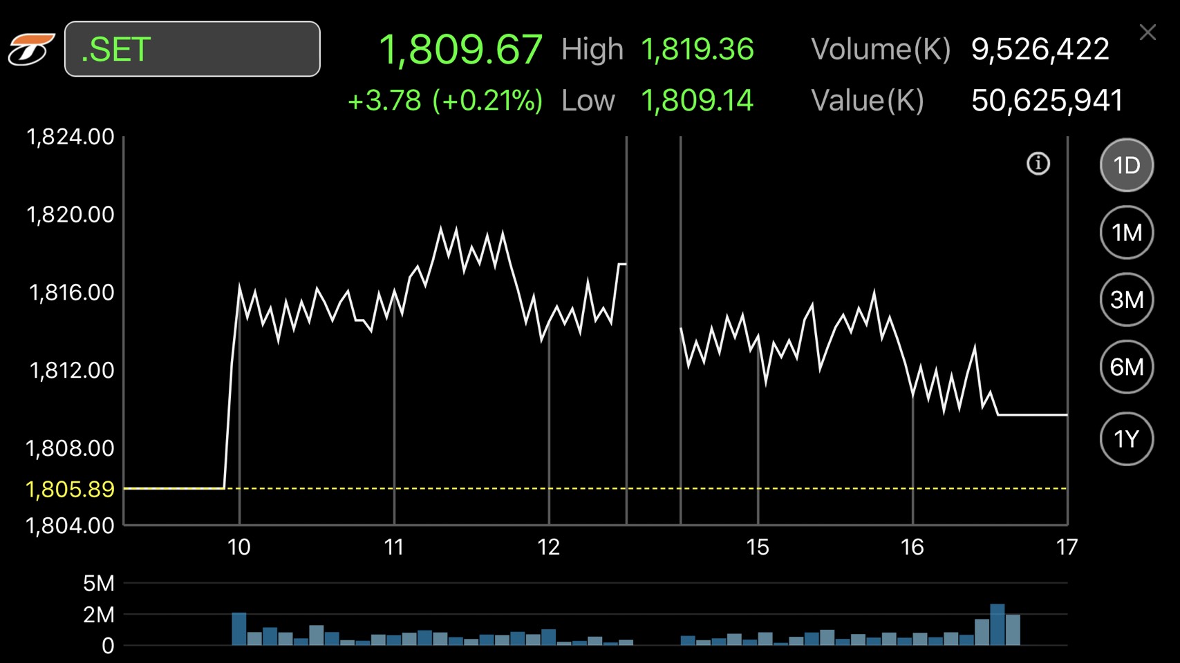 ผู้สื่อข่าวรายงานว่าดัชนีตลาดหลักทรัพย์ฯ ปิดการซื้อขายวันนี้ (19 ก.พ.) ที่ระดับ 1,809.67 จุด เพิ่มขึ้น 3.78 จุด หรือร้อยละ 0.21 มูลค่าการซื้อขาทย 50,625.94 ล้านบาท การซื้อขายหุ้นไทยคลื่อนไหวแดนบวกตลอดชั่วโมงซื้อขาย โดยสูงสุดที่ 1,819.36 จุด และต่ำสุดที่ 1,809.14 จุด