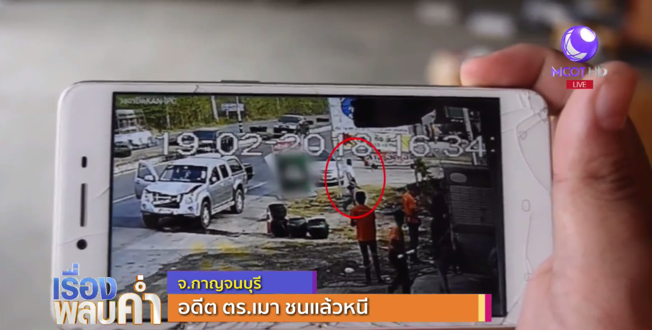 จากภาพวงจรปิดบริษัทขนส่งสินค้า บนถนนสายกาญจนบุรี-ลาดหญ้า หน้าร้านอาหารครัวร่มเย็น พื้นที่หมู่ 8 ตำบลหนองบัว อำเภอเมือง จังหวัดกาญจนบุรี สังเกตมุมบนด้านขวามือ จะเห็นรถกระบะอีซูซุ ดีแม็กซ์ สี่ประตู สีบรอนซ์เงิน พุ่งชนรถจักรยานยนต์ที่วิ่งอยู่เลนซ้ายสุดได้อย่างชัดเจน จนร่างของผู้ขับขี่กลิ้งไปกับพื้นถนนหลายสิบเมตร ก่อนจะเสียหลักชนป้ายร้านอาหารพังเสียหาย ก่อนรถจะดับข้างทาง ซึ่งคนขับที่ใส่เสื้อสีขาว เดินโซซัดโซเซลงจากรถ คล้ายคนเมาสุรา และถอดเข็มขัดกางเกงพยายามจะปัสสาวะ แต่ไม่ไหวล้มลงกระแทกพื้น พลเมืองดีแถวนั้นจึงเข้าไปช่วยพยุงลุกขึ้น ก่อนที่ชายคนดังกล่าวจะเข้าไปปัสสาวะข้างทาง แต่ปรากฏว่ากลับขึ้นรถจักรยานยนต์อีกคันที่มารับตัวออกไปจากจุดเกิดเหตุ ก่อนที่ตำรวจจะเดินทางมาถึง