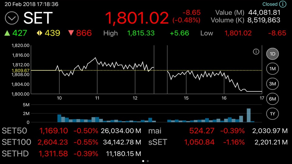 ผู้สื่อข่าวรายงานดัชนีตลาดหลักทรัพย์ฯ ปิดวันนี้ (20 ก.พ.) ที่ระดับ 1,801.02 จุด ลดลง 8.65 จุด หรือร้อยละ 0.48 มูลค่าการซื้อขาย 44,081.81 ล้านบาท โดยดัชนีหุ้นไทยเคลื่อนไหวทั้งแดนบวก-ลบ แตะจุดสูงสุดที่ 1,815.33 จุด และต่ำสุดที่ระดับ 1,801.02 จุด
