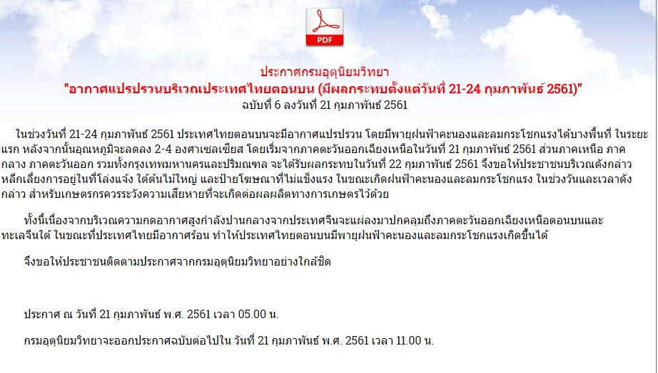 กทม. 21 ก.พ. – กรมอุตุนิยมวิทยาประกาศเตือนอากาศแปรปรวนบริเวณประเทศไทยตอนบน ฉบับที่ 6 ลงวันที่ 21 กุมภาพันธ์ 2561 มีผลกระทบตั้งแต่วันที่ 21-24 กุมภาพันธ์