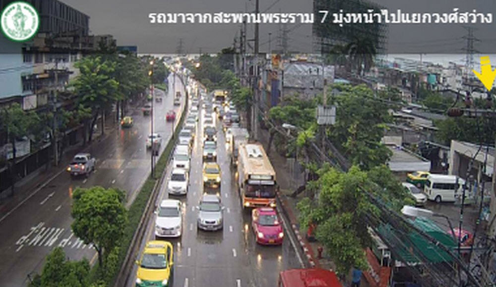 สภาพการจราจร ถนนรัชดา ขาเข้า จากสะพานพระราม7 มุ่งหน้าวงศ์สว่าง-ต่างระดับรัชวิภา รถมาก ท้ายอยู่สะพานพระราม7