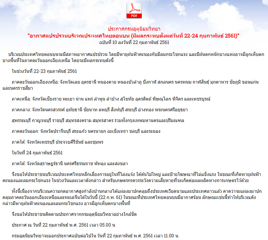 กทม. 22 ก.พ. – กรมอุตุนิยมวิทยา ประกาศเตือนอากาศแปรปรวนบริเวณประเทศไทยตอนบน ฉบับที่ 10 ลงวันที่ 22 กุมภาพันธ์ 2561 โดยมีผลกระทบตั้งแต่วันที่ 22-24 กุมภาพันธ์