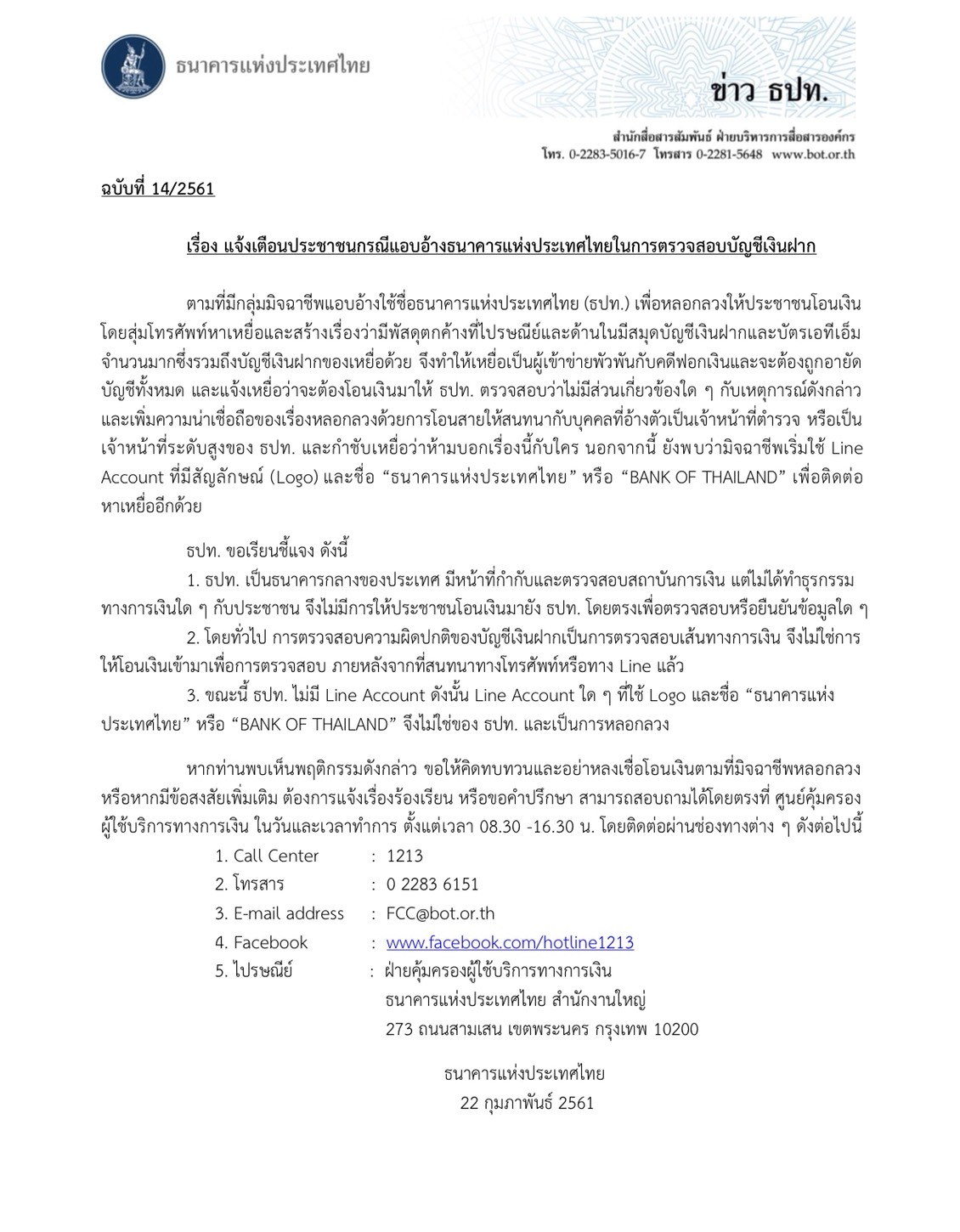 ธปท.ขอเรียนชี้แจงว่า ธปท.เป็นธนาคารกลางของประเทศมีหน้าที่กำกับและตรวจสอบสถาบันการเงิน แต่ไม่ได้ทำธุรกรรมทางการเงินใด ๆ กับประชาชน จึงไม่มีการให้ประชาชนโอนเงินมายัง ธปท.โดยตรง เพื่อตรวจสอบหรือยืนยันข้อมูลใด ๆ นอกจากนี้ โดยทั่วไปการตรวจสอบความผิดปกติของบัญชีเงินฝากเป็นการตรวจสอบเส้นทางการเงิน จึงไม่ใช่การให้โอนเงินเข้ามาเพื่อการตรวจสอบ ภายหลังจากที่สนทนาทางโทรศัพท์หรือทาง Line แล้ว และขณะนี้ ธปท.ไม่มี Line Account ดังนั้น Line Account ใด ๆ ที่ใช้ Logo และชื่อ “ธนาคารแห่งประเทศไทย” หรือ “BANK OF THAILAND” จึงไม่ใช่ของ ธปท.และเป็นการหลอกลวง