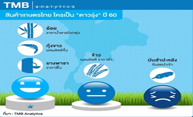 ศูนย์วิเคราะห์เศรษฐกิจทีเอ็มบีวิเคราะห์ว่าสินค้าเกษตรดาวรุ่งที่มีแนวโน้มดีต่อเนื่องถึงปีหน้า คือ อ้อย เนื่องจากราคาน้ำตาลตลาดโลกปรับตัวขึ้นอย่างต่อเนื่องตั้งแต่ต้นปี โดยราคาน้ำตาลทรายดิบตลาดนิวยอร์กปลายเดือนพฤศจิกายนอยู่ที่ 19.8 เซนต์ต่อปอนด์ เพิ่มขึ้นกว่าร้อยละ 50 จากราคาเมื่อเดือนมกราคม 2559 โดยราคาเพิ่มขึ้นอย่างต่อเนื่องหลังจากราคาทำจุดต่ำสุดในเดือนสิงหาคม 2558 และคาดว่าราคายังอยู่ในแนวโน้มที่ดีในปีหน้าหลังอุปทานตลาดโลกตึงตัว ส่งผลให้ปีนี้เกษตรกรผู้ปลูกอ้อยยิ้มได้จากราคาอ้อยฤดูกาลผลิต 2559/2560 สูงกว่าปีที่ผ่านมา