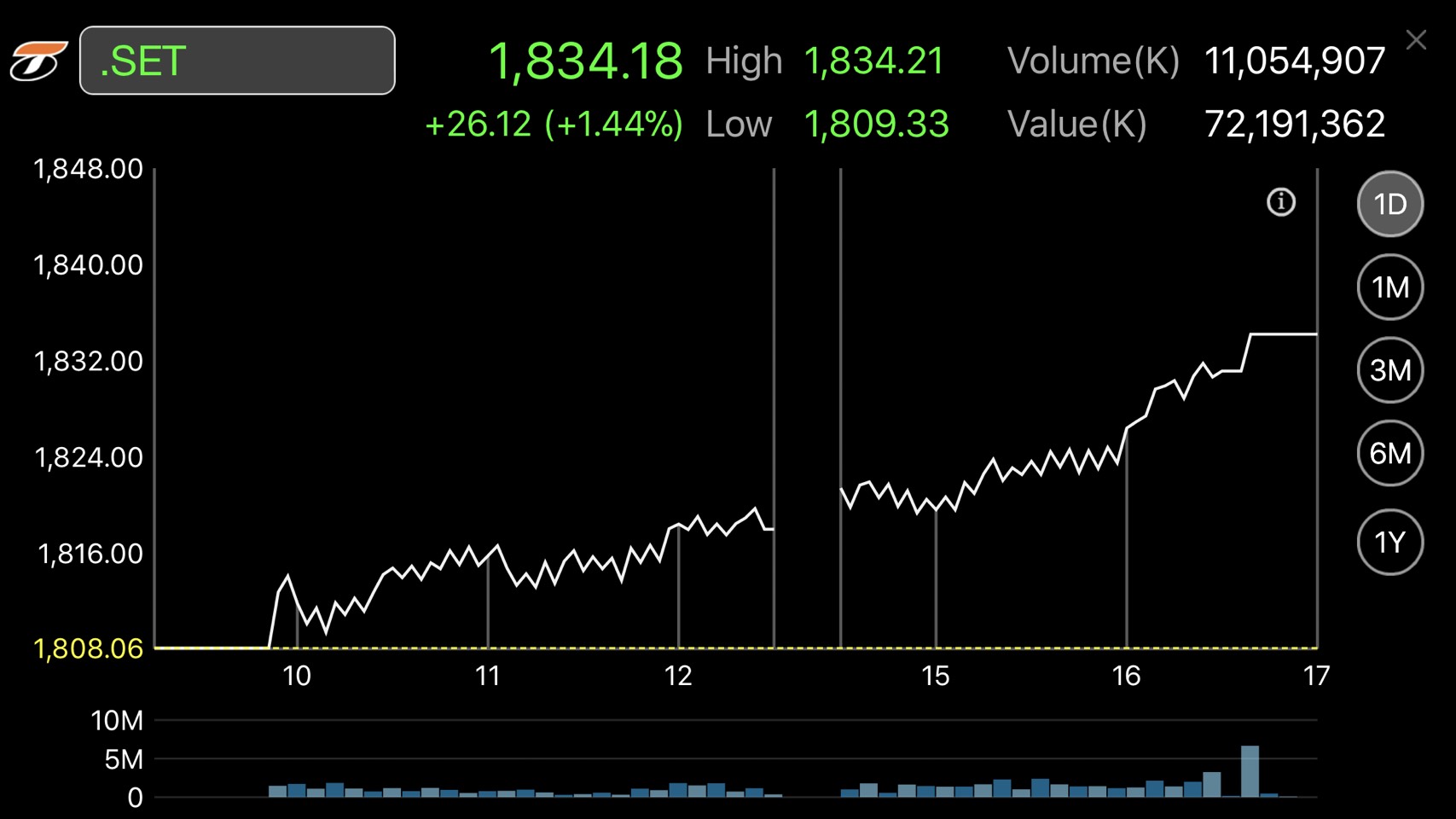 ผู้สื่อข่าวรายงานว่าดัชนีตลาดหลักทรัพย์ฯ ปิดการซื้อขายที่ระดับ 1,834.18 จุด เพิ่มขึ้น 26.12 จุด หรือร้อยละ 1.44 มูลค่าการซื้อขาย 72,191.36 ล้านบาท การซื้อขายหุ้นวันนี้คึกคักมาก ดัชนีกลับมาร้อนแรงอีกครั้ง โดยสูงสุดของวันที่ระดับ 1,834.21 จุด และต่ำสุดของวันที่ระดับ 1,809.33 จุด แรงซื้อมีเข้ามาหนาแน่น โดยเฉพาะในหุ้น ปตท.ที่ทำสถิติสูงสุดเป็นประวัติการณ์ที่ 566 บาท นอกจากนี้ มีแรงซื้อกลุ่มธนาคาร