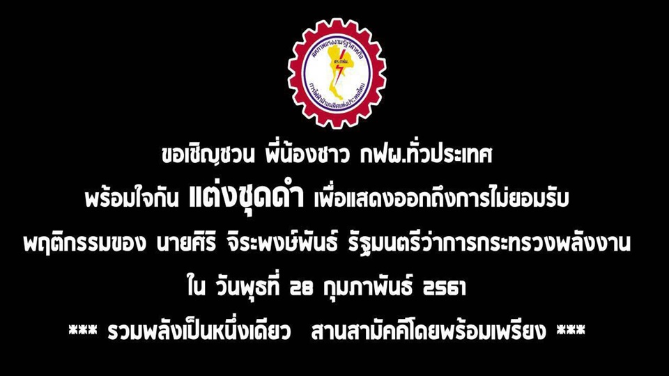 นายศิริชัย ไม้งาม ประธานสหภาพแรงงานรัฐวิสาหกิจ การไฟฟ้าฝ่ายผลิตแห่งประเทศไทย (สร.กฟผ.) เปิดเผยว่า วันที่ 28 กุมภาพันธ์นี้ สร.กฟผ.ได้รณรงค์ให้พนักงาน กฟผ.ทั้งหมดแต่งชุดดำและส่วนหนึ่งจะเดินทางมายังกระทรวงพลังงานในช่วงเช้า เพื่อคัดค้านกรณีที่นายศิริ จิระพงษ์พันธ์ รัฐมนตรีว่าการกระทรวงพลังงาน ได้ใช้อำนาจเกินหน้าที่ไปลงนาม (MOU) กับเครือข่ายต่อต้านโรงไฟฟ้าถ่านหินกระบี่ – เทพา โดยให้ถอนการศึกษาด้านสิ่งแวดล้อมและสุขภาพ และให้มีการศึกษาพื้นที่เชิงยุทธศาสตร์ (SEA) ภายใน 90 วัน