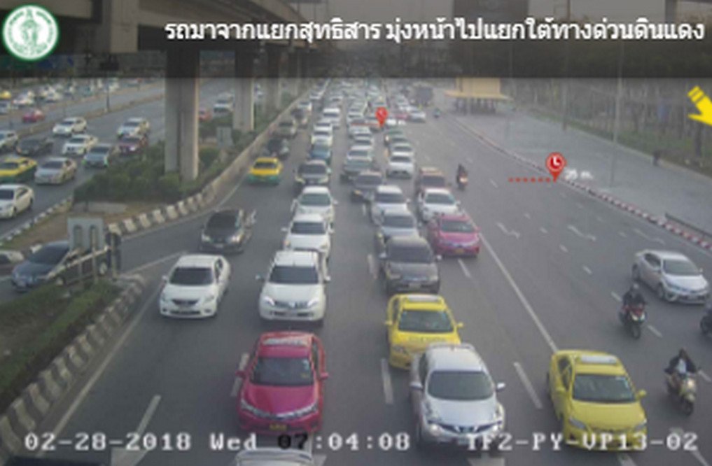 กทม. 28 ก.พ.-สวพ.FM 91 รายงานจราจรเช้าวันพุธ ถนนวิภาวดี – รังสิต ขาเข้า จากแยกสุทธิสาร มุ่งหน้าใต้ด่วนดินแดง รถมาก ท้ายสะสมปากซอยมิตรไมตรี