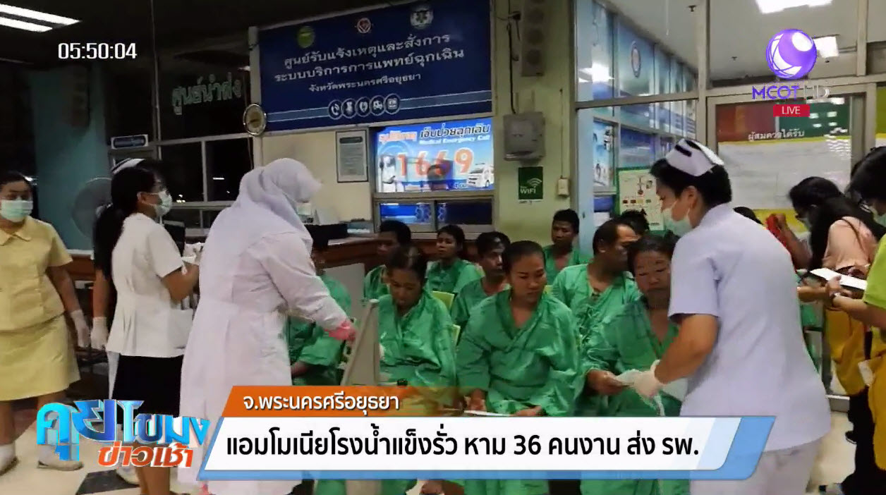 อยุธยา 1 มี.ค.-ก๊าชแอมโมเนียโรงงานผลิตน้ำแข็งรั่ว หาม 36 คนงานส่งโรงพยาบาลอลหม่าน แพทย์ให้การช่วยเหลือปลอดภัยและไม่ได้รับอันตรายรุนแรง