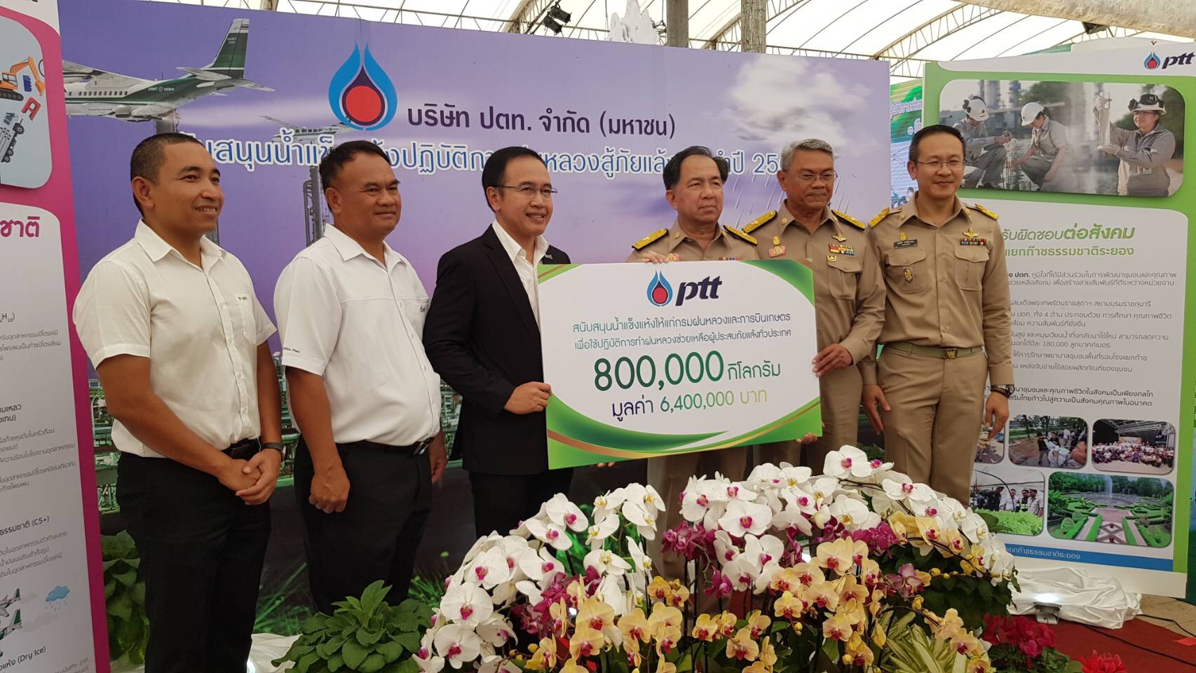 นายนพดล ปิ่นสุภา รองกรรมการผู้จัดการใหญ่หน่วยธุรกิจก๊าซธรรมชาติ บริษัท ปตท. จำกัด (มหาชน) เปิดเผยว่า ปตท. ได้มอบน้ำแข็งแห้งจำนวน 800 ตัน มูลค่ารวม 6.4 ล้านบาท ให้แก่ นายกฤษฎา บุญราช รัฐมนตรีว่าการกระทรวงเกษตรและสหกรณ์ เนื่องใน พิธีเปิดปฏิบัติการฝนหลวงสู้ภัยแล้ง ประจำปี 2561 ณ สนามบินนครสวรรค์ จังหวัดนครสวรรค์ เพื่อใช้ในปฏิบัติการทำฝนเทียมช่วยเหลือผู้ประสบภัยแล้งทั่วประเทศ ซึ่ง ปตท. ได้สนับสนุนน้ำแข็งแห้งให้แก่โครงการฝนหลวงต่อเนื่องเป็นปีที่ 20 นับตั้งแต่ปี 2541 เป็นต้นมา รวมกว่า 10,320 ตัน และถังบรรจุน้ำแข็งแห้ง จำนวน 38 ถัง คิดเป็นมูลค่ารวมทั้งสิ้นกว่า 84.4 ล้านบาท
