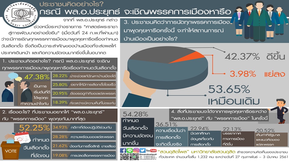 จากที่ พล.อ.ประยุทธ์ กล่าวช่วงหนึ่ง ระหว่างรายการ “ศาสตร์พระราชาสู่การพัฒนาอย่างยั่งยืน” เมื่อวันที่ 24 ก.พ.ที่ผ่านมา ว่าจะมีการเชิญทุกพรรคการเมืองมาพูดคุยหารือเรื่องกำหนดวันเลือกตั้ง ซึ่งถือเป็นวาระสำคัญของบ้านเมืองที่จะส่งผลให้ประเทศเดินหน้า และเกิดความชัดเจนมากยิ่งขึ้นในอนาคต เพื่อสะท้อนความคิดเห็นของประชาชนต่อกรณีดังกล่าว “สวนดุสิตโพล” มหาวิทยาลัยสวนดุสิต ได้สำรวจความคิดเห็นของประชาชนทั่วประเทศ เรื่อง ประชาชนคิดอย่างไร? กรณี พล.อ.ประยุทธ์ จะเชิญพรรคการเมืองหารือ จำนวนทั้งสิ้น 1,232 คน ระหว่างวันที่ 27 กุมภาพันธ์ – 3 มีนาคม 2561 สรุปผลได้ ดังนี้