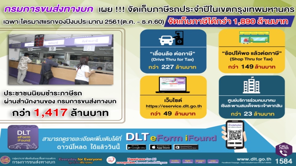 นายกมล บูรณพงศ์ รองอธิบดีกรมการขนส่งทางบก เปิดเผยว่า ไตรมาสแรกของปีงบประมาณ 2561 (ต.ค.-ธ.ค.60) กรมการขนส่งทางบกสามารถจัดเก็บภาษีรถประจำปีตามกฎหมายว่าด้วยรถยนต์ผ่านช่องทางต่าง ๆ เฉพาะในเขตกรุงเทพมหานครกว่า 1,890 ล้านบาท สูงกว่าช่วงเดียวกันปีที่ผ่านมาเก็บได้ 1,726 ล้านบาท