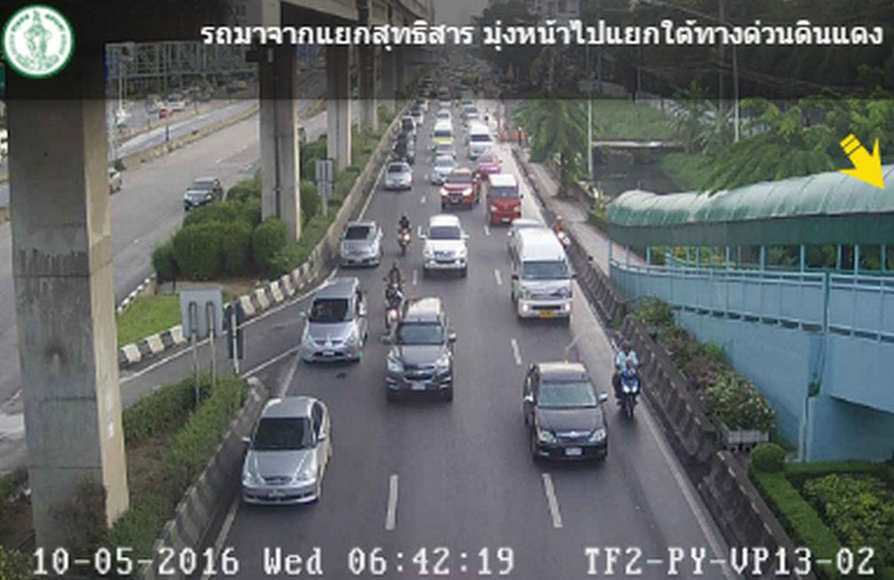 สภาพการจราจร ถนนวิภาวดี จากแยกสุทธิสาร มุ่งหน้าใต้ด่วนดินแดง รถมาก ท้ายสะสมหน้าโรงเรียนสุรศักดิ์มนตรี