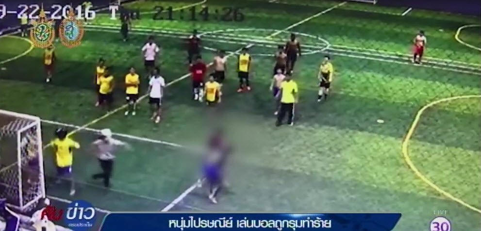 ภาพจากกล้องวงจรปิด ในสนามฟุตซอลหญ้าเทียมแห่งหนึ่งในอำเภอเมืองชลบุรี เมื่อวันที่ 22 ก.ย. ที่ผ่านมา ที่มีการกระทบกระทั่งกันของผู้เล่น 2 ฝ่าย จนเกือบจะมีเรื่องกัน แต่เรื่องก็จบลงเมื่อมีเพื่อนๆ มาห้ามไว้ แต่หลังจากนั้นพอแยกย้ายกันไปที่รถ ก็เกิดเหตุการณ์กลุ่มวัยรุ่นยกพวกรุมทำร้ายคู่กรณี โดยมีการใช้อาวุธจำพวกสนับมือและอาวุธต่างๆ