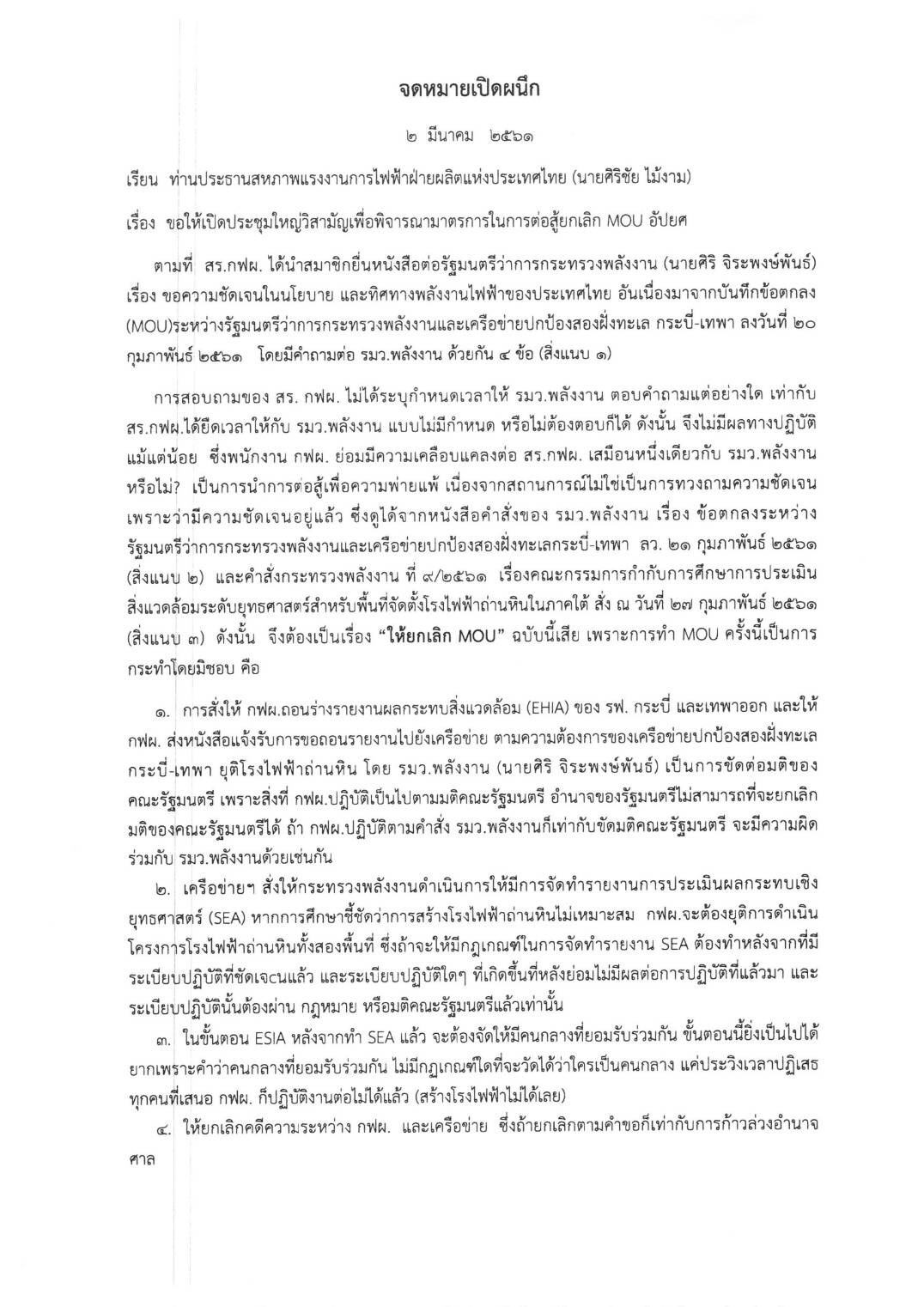 กรุงเทพฯ 5 มี.ค. – สมาชิกสหภาพฯ จี้เปิดประชุมใหญ่วิสามัญ คัดค้านเอ็มโอยูชะลอโรงไฟฟ้าถ่านหิน