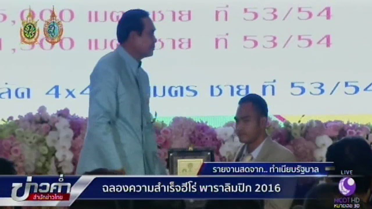 พล.อ.ประยุทธ์ จันทร์โอชา นายกรัฐมนตรี และหัวหน้าคณะรักษาความสงบแห่งชาติ หรือคสช. จัดงานเลี้ยงอาหารค่ำฉลองให้กับนักกีฬาพาราลิมปิกเกมส์ ที่ตึกสันติไมตรี ทำเนียบรัฐบาล โอกาสนี้นายกรัฐมนตรีได้มอบโล่เกียรติคุณ และเงินรางวัลจากกองทุนพัฒนากีฬาแห่งชาติ เพื่อเป็นขวัญและกำลังใจให้กับนักกีฬาทุกคน