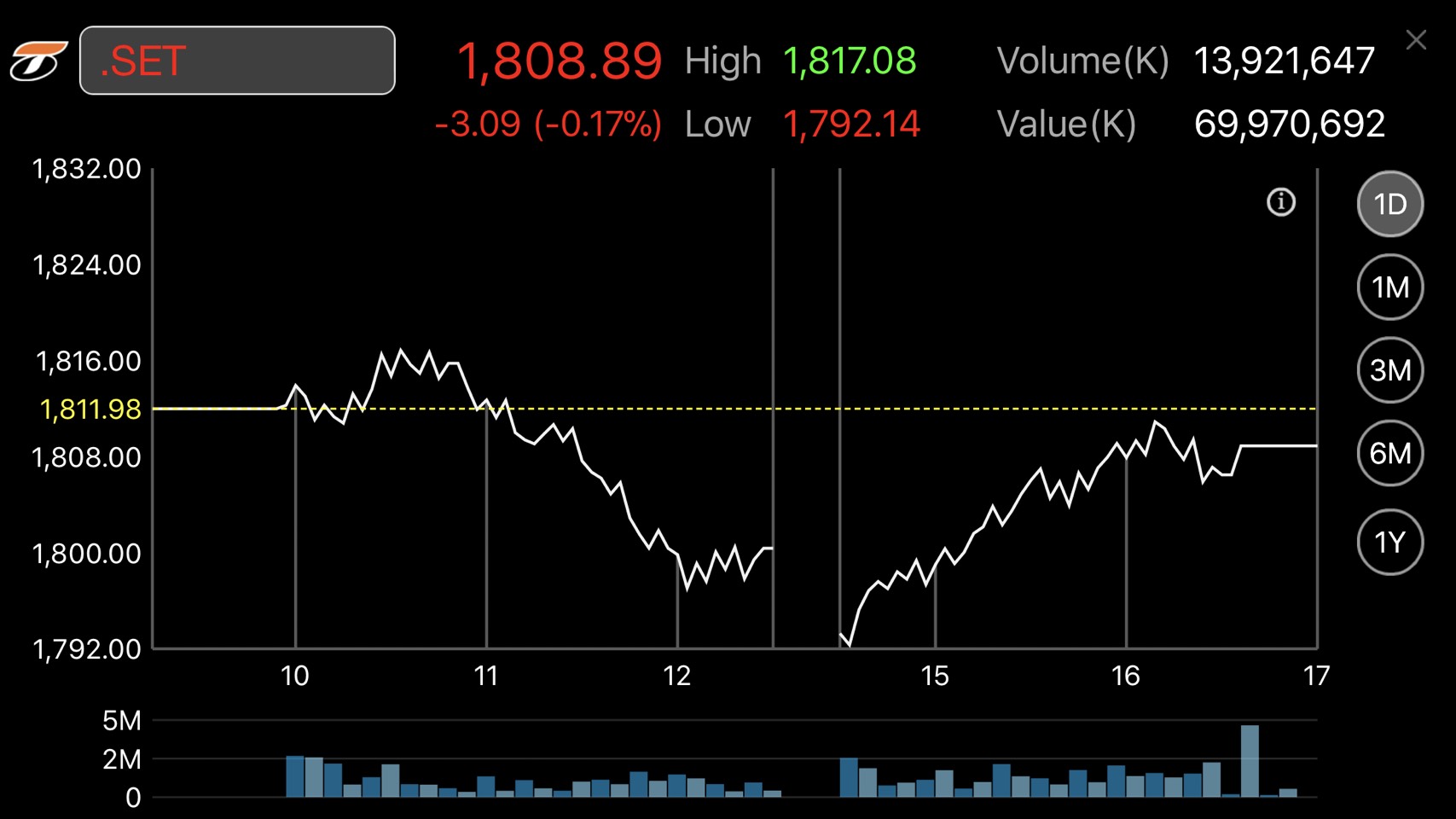 ผู้สื่อข่าวรายงานว่าดัชนีตลาดหลักทรัพย์ฯ ปิดที่ระดับ 1,808.89 จุด ลดลง 3.09 จุดหรือร้อยละ 0.17 มูลค่าการซื้อขาย 69,970.69 ล้านบาท การซื้อขายหุ้นวันนี้ (5 มี.ค.) ดัชนีหุ้นไทยเคลื่อนไหวแดนลบเป็นส่วนใหญ่ โดยดัชนีฯ แตะจุดสูงสุดที่ 1,817.08 จุด และต่ำสุดที่ระดับ 1,792.14 จุด