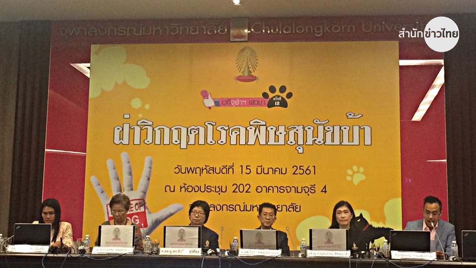 จุฬาลงกรณ์มหาวิทยาลัย จัดเวทีจุฬาฯเสวนา “ฝ่าวิกฤตโรคพิษสุนัขบ้า” เพื่อสร้างความเข้าใจที่ถูกต้องต่อสาธารณชนเกี่ยวกับเรื่องโรคพิษสุนัขบ้าที่กำลังแพร่ระบาดอยู่ในขณะนี้ ซึ่งมีผู้เสียชีวิตจากการติดเชื้อโรคพิษสุนัขบ้าเเล้ว 4 ราย เเละมีการเเพร่ระบาดของโรคเเล้วกว่า 41 จังหวัด โดยการเสวนามีนักวิชาการเเละผู้เชี่ยวชาญที่เกี่ยวข้องเข้าร่วมเสวนาเเละเเลกเปลี่ยนความคิดเห็นจำนวนมาก