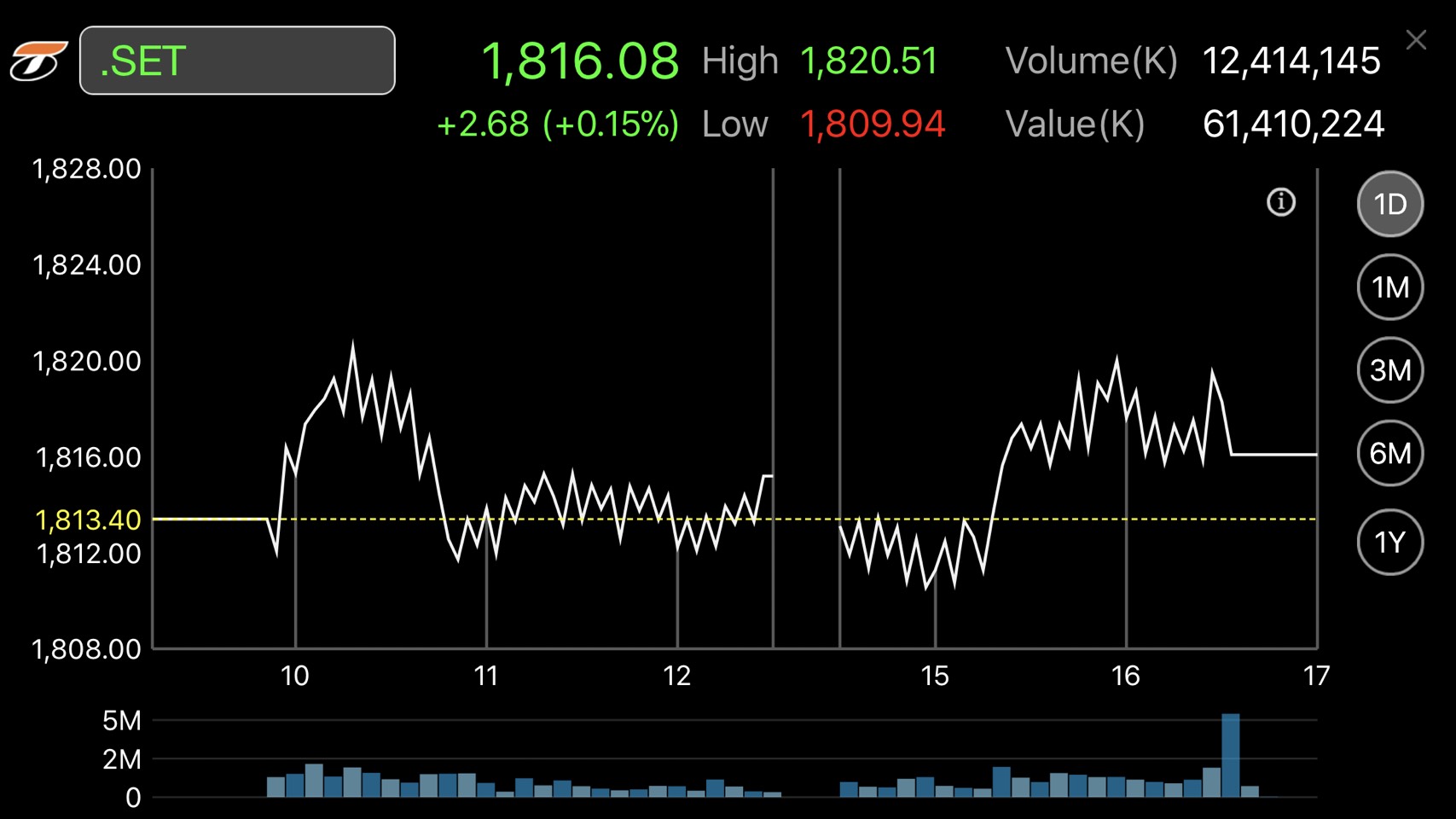 ผู้สื่อข่าวรายงานว่าดัชนีตลาดหลักทรัพย์ฯ ปิดการซื้อขายวันนี้ (15 มี.ค.) ที่ระดับ 1,816.08 จุด เพิ่มขึ้น 2.68 จุด หรือร้อยละ0.15 มูลค่าการซื้อขาย 61,410.22 ล้านบาท การซื้อขายหุ้นวันนี้ ดัชนีหุ้นไทยเคลื่อนไหวทั้งในแดนบวก-ลบ โดยดัชนีฯ แตะจุดสูงสุดที่ 1,820.51 จุด และแตะจุดต่ำสุดที่ระดับ 1,809.94 จุด