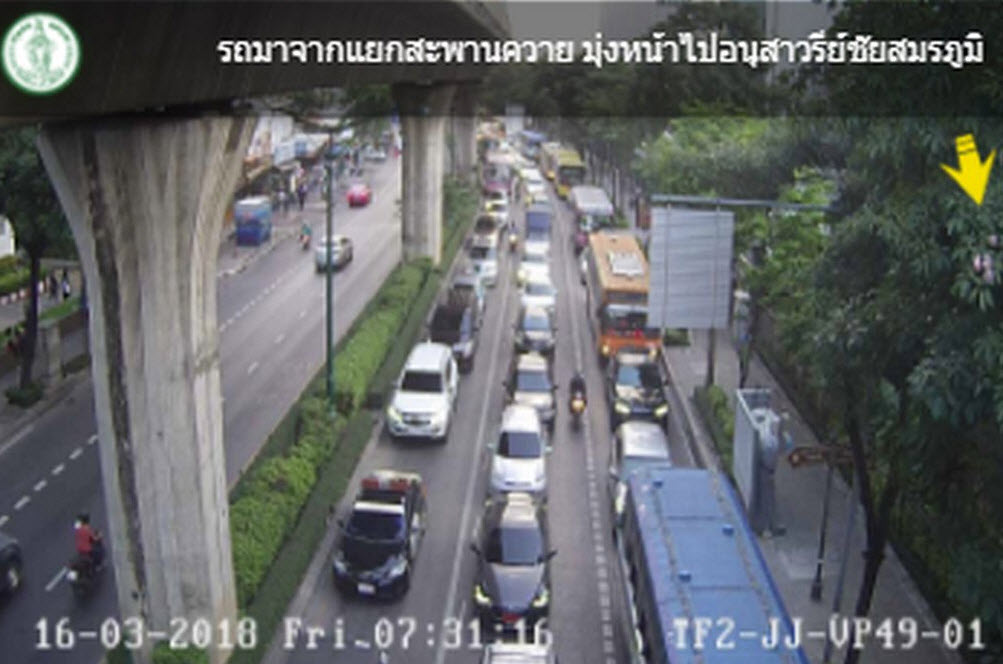กทม. 16 มี.ค.-สวพ.FM91 รายงานจราจรเช้าวันศุกร์ ถนนพหลโยธิน ขาเข้า มุ่งหน้าเข้าอนุสาวรีย์ชัยฯ รถติดขัด ถนนเพชรบุรี ยังเคลื่อนตัวได้เรื่อยๆ