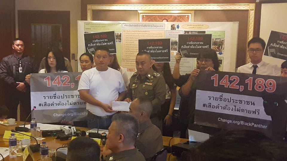 นายศศิน เฉลิมลาภ ประธานมูลนิธิสืบนาคะเสถียร พร้อมเครือข่ายนักศึกษา และตัวแทนภาคประชาชน ที่ร่วมกิจกรรมรณรงค์ “เสือดำต้องไม่ตายฟรี” เดินทางมาที่สำนักงานตำรวจแห่งชาติ เพื่อขอบคุณพลตำรวจเอกศรีวราห์ รังสิพราหมณกุล รองผู้บัญชาการตำรวจแห่งชาติ ที่กำกำบดูแลและเร่งรัดดำเนินคดีกับนายเปรมชัย กรรณสูต และ พวก รวม 4 คน ที่เข้าไปล่าสัตว์ ในเขตรักษาพันธ์สัตวป่าทุ่งใหญ่นเรศวร จนส่งฟ้องต่อพนักงานอัยการได้อย่างรวดเร็ว