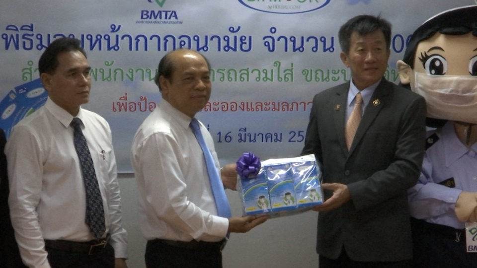 นายประยูร ช่วยแก้ว รองผู้อำนวยการฝ่ายการเดินรถองค์การ รักษาการในตำแหน่งผู้อำนวยการ องค์การขนส่งมวลชนกรุงเทพ (ขสมก.) เปิดเผยว่า ขสมก.ให้ความสำคัญเกี่ยวกับปัญหามลภาวะทางอากาศที่มีแนวโน้มสูงขึ้น โดยเฉพาะในเขตกรุงเทพมหานคร เนื่องจากมีการก่อสร้างโครงการรถไฟฟ้าเส้นทางต่าง ๆ และอาคารที่พักอาศัยตามแนวเส้นทางจำนวนมาก ประกอบกับสภาพการจราจรที่หนาแน่น ทำให้มีการปล่อยควันพิษและมีฝุ่นละอองในอากาศจำนวนมาก จึงได้จัดหาหน้ากากอนามัยให้พนักงานสวมใส่ขณะปฏิบัติหน้าที่ เพื่อป้องกันฝุ่นละอองและมลภาวะต่าง ๆ โดยได้รับการสนับสนุนหน้ากากอนามัยยี่ห้อ Dr.MSK (ดร.เอ็ม เอส เค) จำนวน 20,000 ชิ้น จากบริษัท พี.ซี.ไอ.โอเวอร์ซีส์ จำกัด โดยไม่คิดค่าใช้จ่ายใด ๆ เพื่อร่วมเสริมสร้างสุขภาพอนามัยที่ดีให้กับพนักงาน ขสมก. โดยหน้ากากอนามัยยี่ห้อดังกล่าวได้รับมาตรฐาน Medical grade japan และผ่านการตรวจสอบจากสถาบันตรวจสอบคุณภาพมาตรฐานสากล Nelson Lab สามารถกรองฝุ่นละอองขนาดอนุภาค 2.5 ไมครอน (PM 2.5) ได้อย่างมีประสิทธิภาพ.-สำนักข่าวไทย