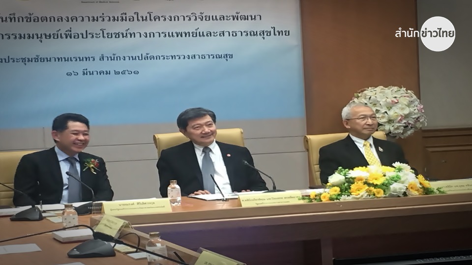 นพ.ปิยะสกล สกลสัตยาทร รัฐมนตรีว่าการกระทรวงสาธารณสุข (สธ.) พร้อมด้วย นพ.อุดม คชินทร รัฐมนตรีช่วยว่าการกระทรวงศึกษาธิการ (ศธ.) และดร.กัญญวิมว์ กีรติกร ผู้ช่วยรัฐมนตรีประจำ กระทรวงวิทยาศาสตร์และเทคโนโลยี ลงนามความร่วมมือโครงการวิจัยและพัฒนาการใช้ข้อมูลพันธุกรรมมนุษย์เพื่อประโยชน์ทางการแพทย์ และสาธารณสุขไทย ระหว่าง กรมวิทยาศาสตร์การแพทย์ กระทรวงสาธารณสุข และคณะแพทยศาสตร์ต่างๆ ของมหาวิทยาลัย เพื่อนำข้อมูลพันธุกรรมของประชาชน คนไทย ในกลุ่มตัวอย่าง 50,000 คน มาพัฒนาเป็นฐานข้อมูลทางพันธุกรรมใช้ประโยชน์ในการรักษาโรคต่อไปในอนาคต โดยสามารถตรวจหาพันธุกรรมการแพ้ยาหรือการดื้อยาป้องกันโรคสตีเวนส์จอห์นสันซินโดรม ที่ทำให้เกิดการแพ้อย่างรุนแรง แก่ผิวหนัง ตาบอด หรือเสียชีวิต การรักษาโรคด้วยการไขและประยุกต์รหัสพันธุกรรม ทำให้การรักษาโรคมีความแม่นยำ โดยคาดว่าการพัฒนาจะเริ่มเป็นรูปร่างปรากฎชัดภายใน 3 ปี .-สำนักข่าวไทย