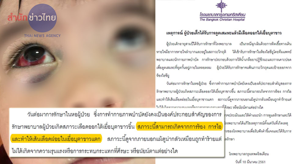 ทางด้าน โรงพยาบาลกรุงเทพคริสเตียน ได้ออกแถลงชี้แจงเรื่องดังกล่าวว่า จาก เหตุการณ์ ผู้ป่วยเด็กได้รับการดูดเสมหะแล้วมีเลือดออกใต้เยื่อบุตาขาว ผู้ป่วยเด็กอายุสามปีได้รับการรักษาที่โรงพยาบาล เป็นกรณีฉุกเฉินด้วยการติดเชื้อทางเดินหายใจมีอาการหายใจลำบากและอยู่ในสภาวะวิกฤติ ได้เข้ารับการรักษาในห้องไอซียูโดยทีมแพทย์พยาบาลและนักกายภาพบาบัด การรักษาประกอบด้วยการให้น้าเกลือยาปฏิชีวนะและการเคาะปอดเพื่อดูดเสมหะที่อุดกั้นอยู่ภายในหลอดลม ผู้ป่วยได้รับการรักษาจนพ้นภาวะวิกฤตและย้ายออกจากห้องไอซียู วันต่อมาการรักษาในหอผู้ป่วย ซึ่งการทากายภาพบาบัดยังคงเป็นองค์ประกอบสาคัญของการรักษาพยาบาลผู้ป่วยเกิดสภาวะเลือดออกใต้เยื่อบุตาขาวขึ้น สภาวะนี้สามารถเกิดจากการร้อง การไอและทำให้เส้นเลือดฝอยในเยื่อบุตาขาวแตก สภาวะนี้ดูจากภายนอกแม้ดูน่ากลัวเหมือนถูกทาร้ายแต่ไม่ได้เกิดจากความรุนแรงหรือการกระทบกระแทกที่ศีรษะ หรือนัยน์ตาแต่อย่างใด
