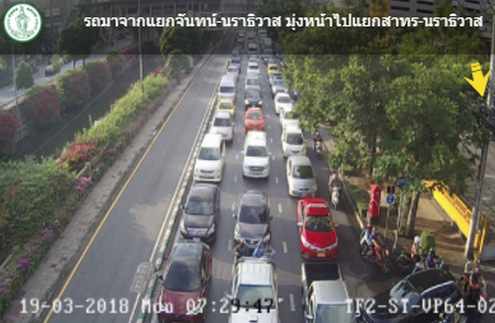 กทม. 19 มี.ค.-สวพ.FM 91 รายงานจราจรเช้าวันจันทร์ ถนนนราธิวาสราชนครินทร์ ขาเข้า ไปแยกนรินทร รถหนาแน่น ท้ายสะสมอยู่ที่ปากซอยนราธิวาสฯ 10