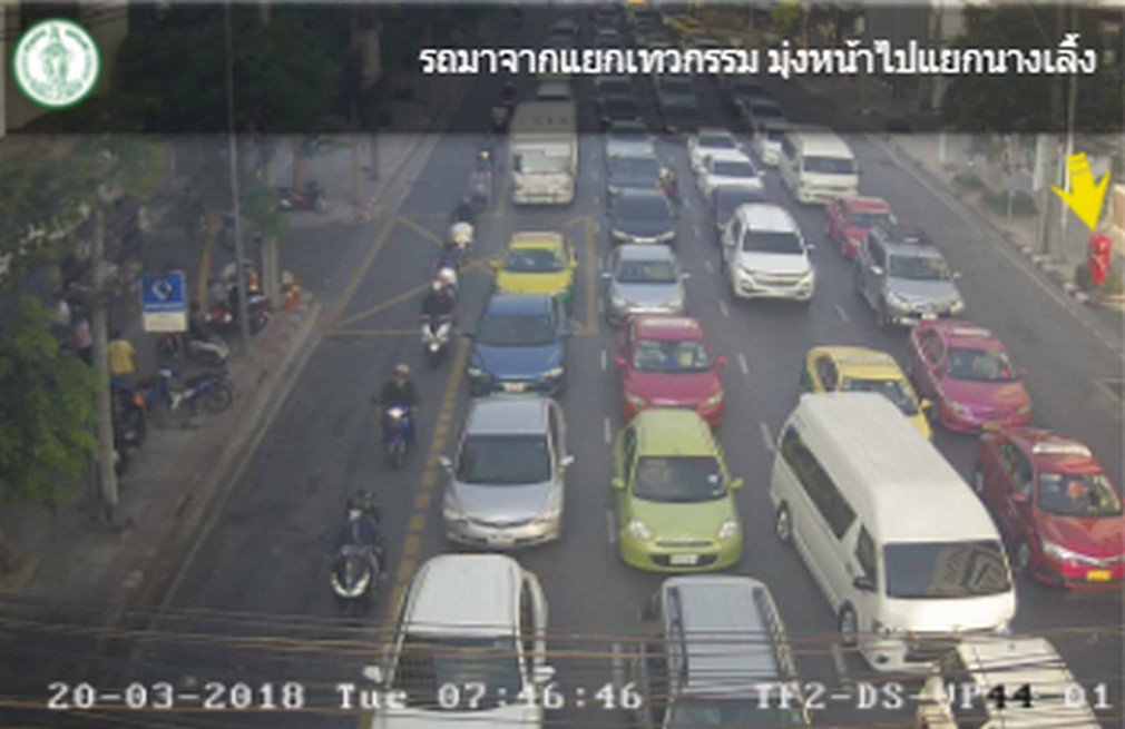 กทม. 20 มี.ค.-สวพ.FM 91 รายงานจราจรเช้าวันอังคาร ถนนนครสวรรค์ มุ่งหน้าแยกนางเลิ้ง การจราจรติดขัด ท้ายสะสมอยู่ที่แยกเทวกรรม