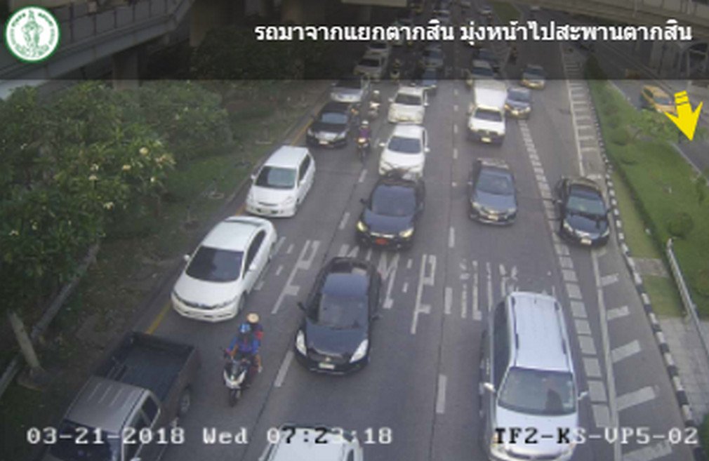 กทม. 21 มี.ค.-สวพ.FM 91 รายงานจราจรเช้าวันพุธ สะพานสมเด็จพระเจ้าตากสิน ขาเข้า รถเริ่มติดขัด มีท้ายสะสมใต้บีทีเอสกรุงธนบุรี
