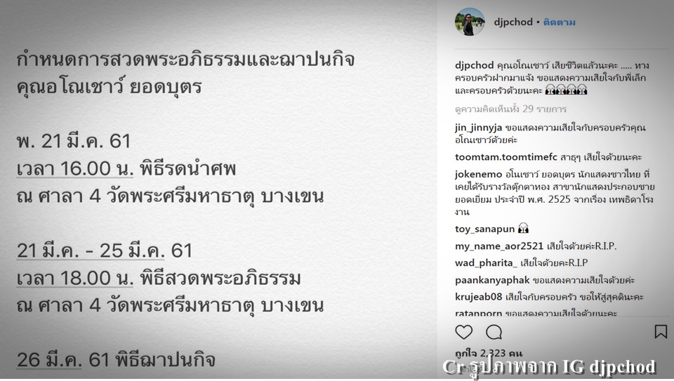 เป็นข่าวเศร้าของวงการบันเทิงเมื่ออโณเชาว์ ยอดบุตร อดีตพระเอกภาพยนตร์ชื่อดัง เสียชีวิตแล้วอย่างสงบ หลังนอนป่วยเป็นเจ้าชายนิทรามานานกว่า 34 ปีโดยครอบครัวยอดบุตร จะมีพิธีรดน้ำศพในวันนี้ 21 มีนาคม ณ ศาลา 4 วัดพระศรีมหาธาตุบางเขนฯ เวลา 16.00 น. และจะสวดพระอภิธรรมศพถึง 25 มีนาคมก่อนจะทำพิธีฌาปนกิจในวันที่ 26 มีนาคม