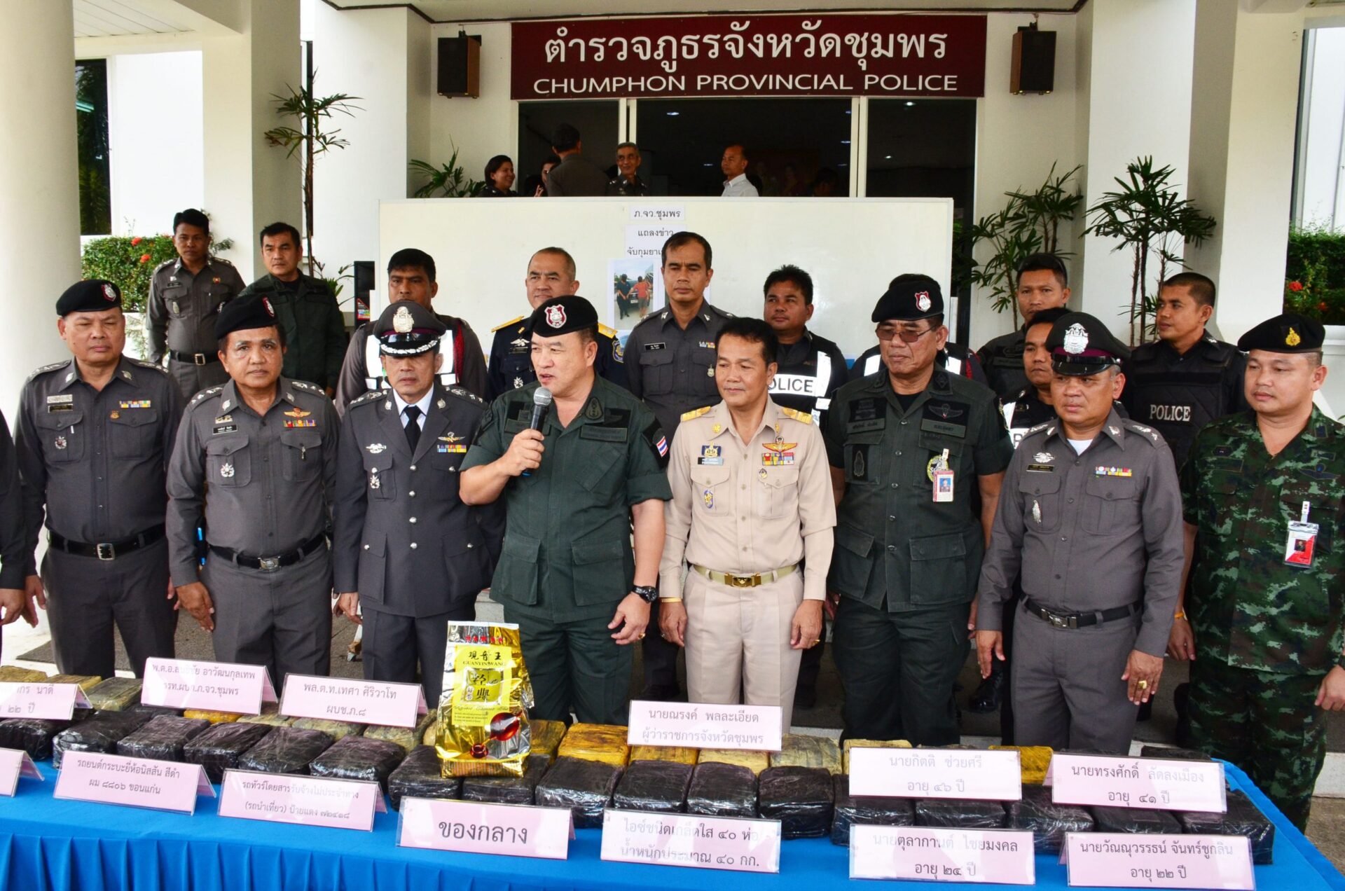 พล.ต.ท.เทศา ศิริวาโท ผู้บัญชาการตำรวจภูธรภาค 8 นายณรงค์ พลละเอียด ผู้ว่าราชการจังหวัดชุมพร และนายพีระ กาญจนพงษ์ ผู้เชี่ยวชาญด้านการป้องกันและปราบปรามยาเสพติด (ปปส.) และนายสราวุธ ภัคดี ผู้อำนวยการส่วนอำนวยการบังคับใช้กฎหมาย สำนักงาน ปปส.ภาค 8 แถลงจับกุม 6 ผู้ต้องหายาเสพติด พร้อมของกลางยาไอซ์ชนิดเกล็ด น้ำหนัก 40 กิโลกรัม มูลค่า 120 ล้านบาท โดยผู้ต้องหาใช้รถกระบะ สีดำ ทะเบียน ผม 8806 ขอนแก่น ขับนำทางจะผ่านด่านตรวจประตูภาคใต้ บ้านพละ หมู่ 3 ถนนเพชรเกษม ตำบลเขาไชยราช อ.ปะทิว จ.ชุมพร แต่เจ้าหน้าที่สังเกตผู้ต้องหาพี่น้องมีท่าทางพิรุธประกอบกับมีเสียงโทรศัพท์ดังขึ้นหลายครั้ง และไม่รับสาย แต่กลับปิดเครื่อง เจ้าหน้าที่จึงควบคุมตัวทั้งสองมาสอบปากคำ พร้อมตรวจสอบข้อมูลการใช้โทรศัพท์ กระทั่งยอมรับสารภาพขับรถนำทางให้กับรถทัวร์โดยสารไม่ประจำทาง (รถนำเที่ยว) ทะเบียนป้ายแดง 72418 ใช้เพื่อขายหรือซ่อมที่มียาเสพติดซุกซ่อนมาด้วย แล่นตามหลังห่างกันมา 10 กิโลเมตร