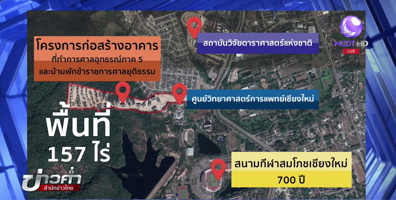 เชียงใหม่ 21 มี.ค.-สำนักข่าวไทยตรวจสอบภาพแผนที่และพิกัดโครงการก่อสร้างอาคารที่ทำการศาลอุทธรณ์ภาค 5 และบ้านพักข้าราชการตุลาการ พบว่าบริเวณดังกล่าวมีลักษณะทางกายภาพเป็นพื้นที่แหลมเข้าไปบริเวณเชิงดอยสุเทพ ใกล้กับสถานที่สำคัญในตัวเมือง