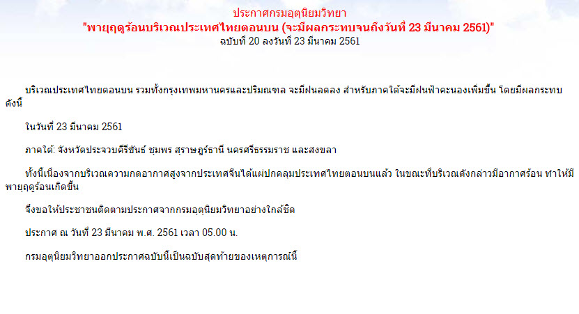 กทม. 23 มี.ค. – กรมอุตุนิยมวิทยาพยากรณ์อากาศ 24 ชั่วโมงข้างหน้า บริเวณประเทศไทยตอนบนจะมีฝนลดลง ส่วนภาคใต้จะมีฝนเพิ่มขึ้น บริเวณจังหวัดประจวบคีรีขันธ์ ชุมพร สุราษฎร์ธานี นครศรีธรรมราช และสงขลา